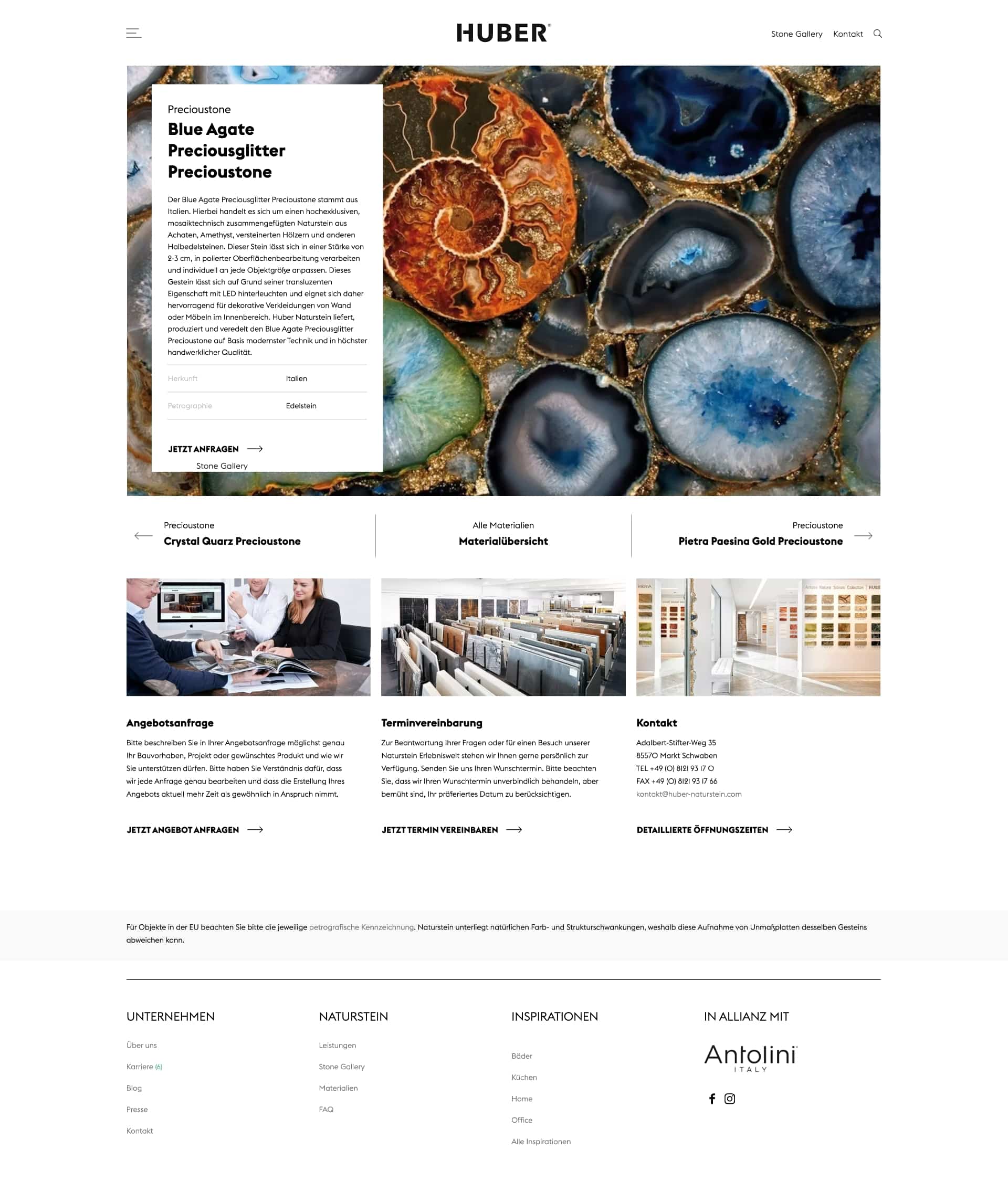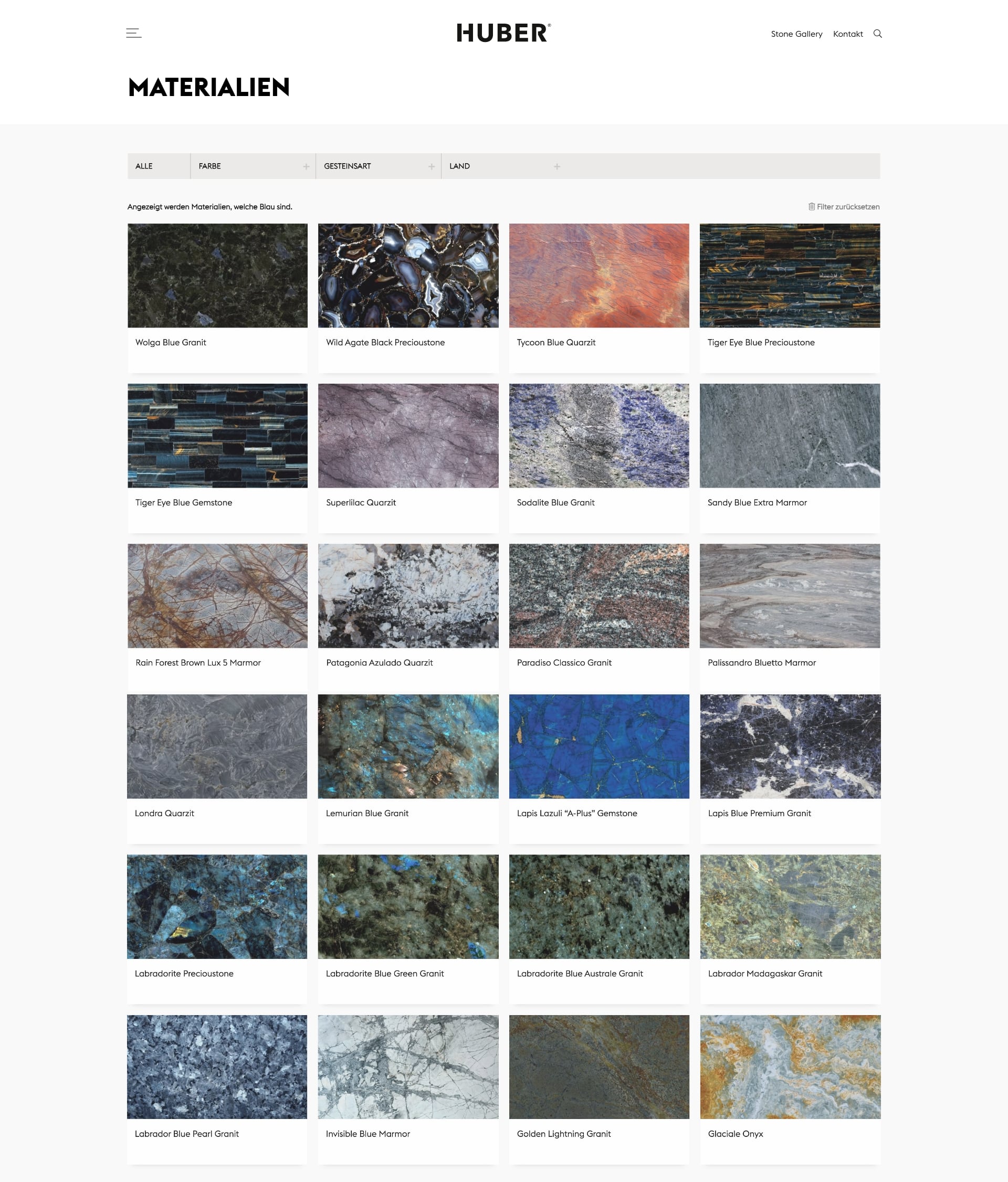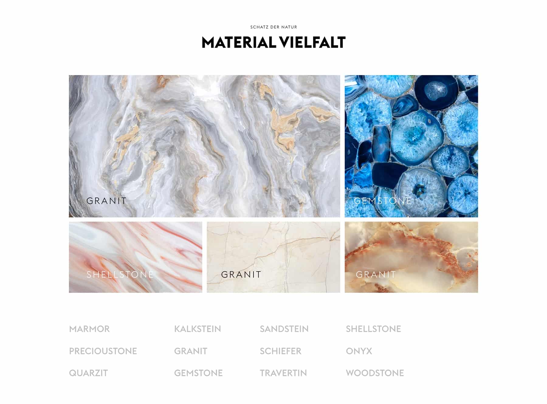 Naturstein digital und emotional erlebbar zu machen bestimmte die Hauptanforderung der Corporate Website, aber insbesondere für die Materialdatenbank. Dort präsentieren sich sortiert nach Farbe, Gesteinsart und Land knapp 1.000 Materialien, die detailliert um Informationen zu petrografischen Eigenschaften und empfohlenen Anwendungsbereichen ergänzt wurden.