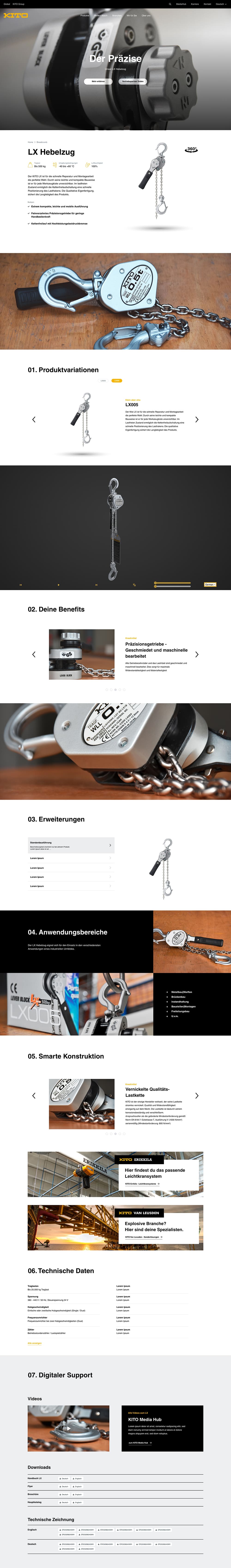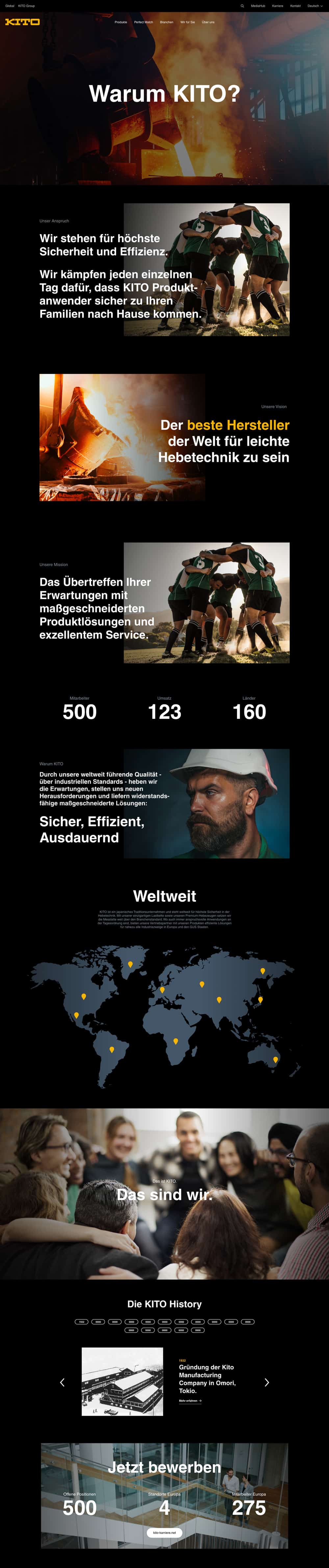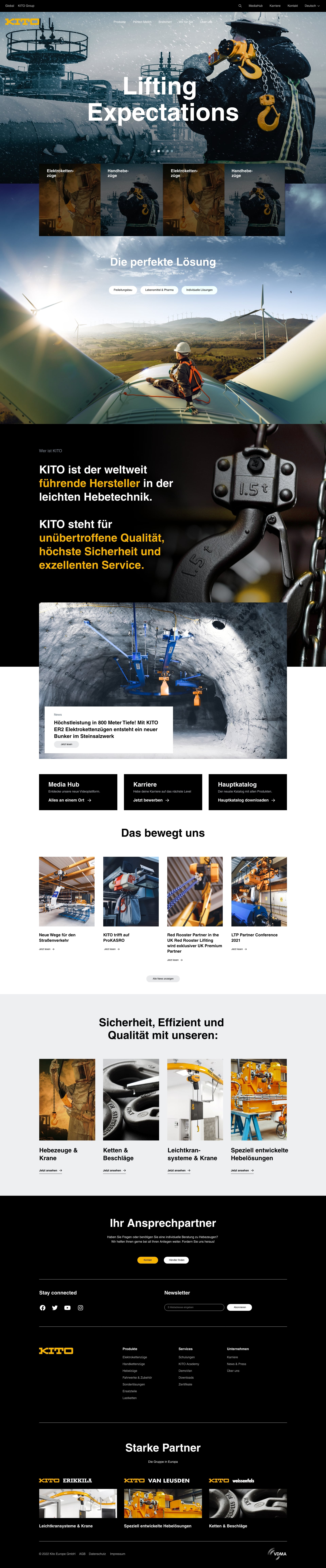 Wir haben den Relaunch der Website für Kito übernommen, mit dem Ziel, eine emotionale Produktwelt zu schaffen, die ein eigentlich technisch und sicherheitsbezogenes Produkt erlebbar macht. Die zentralen Attribute von Kito – Sicherheit, Zuverlässigkeit und Robustheit – sollten für die User spürbar werden.