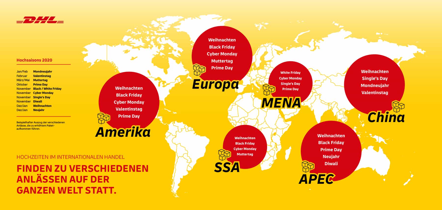 Feiertage und Shoppingevents stellen die Logistikbranche vor große Herausforderungen. Neben uns bekannten Anlässen wie Weihnachten oder dem Black Friday gibt es viele weitere wie z.B. den Single´s Day in China oder Diwali in Indien. Wir wurden damit beauftragt eine Infografik zu erstellen welche die wichtigsten internationalen Anlässe weltweit veranschaulicht.