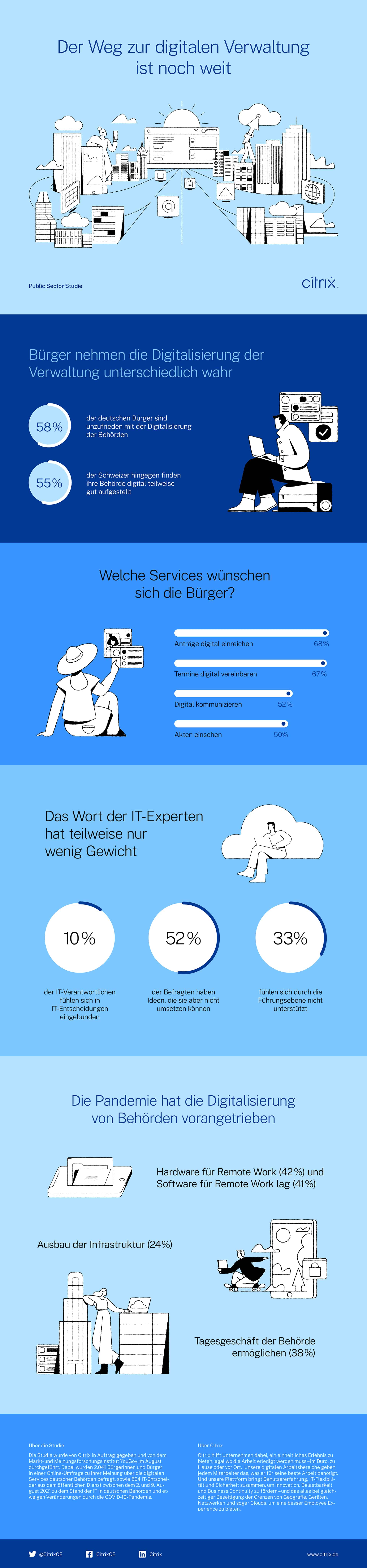 Die Bürger in Deutschland und der Schweiz nehmen die Digitalisierung der Verwaltung unterschiedlich wahr. Während die deutschen Bürger eher unzufrieden mit der Digitalisierung der Behörden sind, finden hingegen die Schweizer ihre Behörden digital teilweise gut aufgestellt. Im Rahmen der von Citrix beauftragten Studie wurden diese und viele weitere Erkenntnisse gewonnen. Die Ergebnisse wurden unter strenger Einhaltung des Corporate Design im Rahmen einer Infografik aufbereitet.