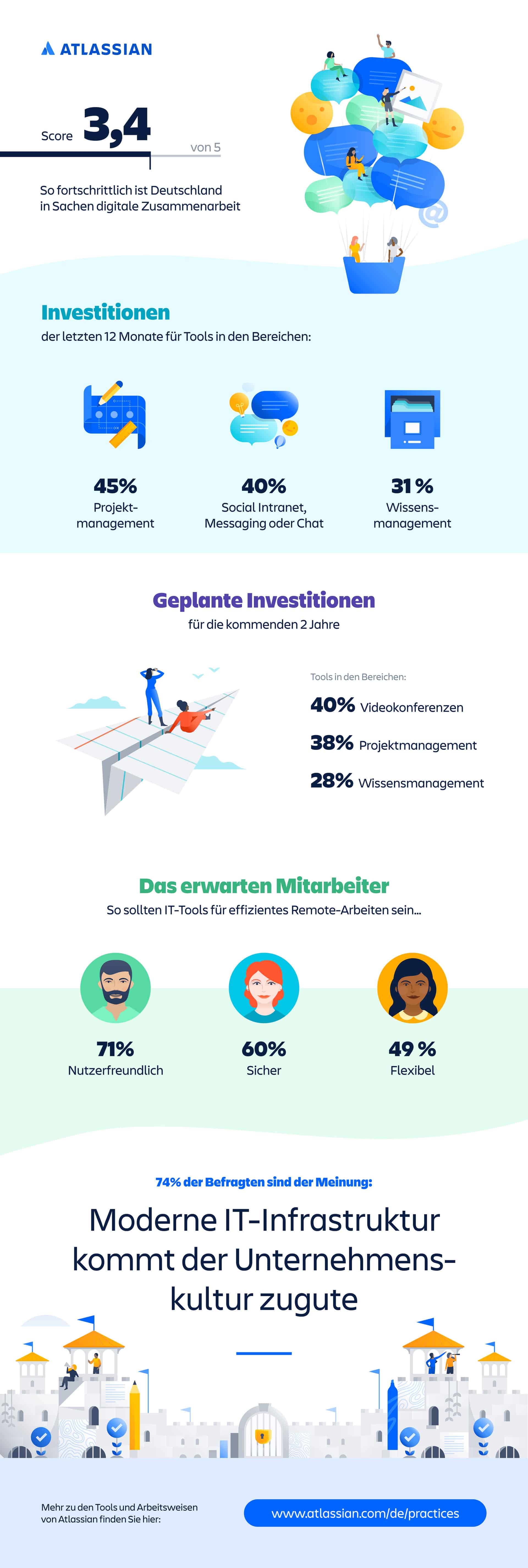 Der Collaboration Maturity Score von Atlassian gibt den Fortschritt bei der digitalen Zusammenarbeit wieder. Im Rahmen der jährlichen Studie werden Befragungen unter IT-Experten zu Themen wie digitaler Kommunikation, Investitionen in Tools, Remote-Work und IT-Infrastruktur durchgeführt. Zum Zwecke der Visualisierung wurden die Ergebnisse unter Berücksichtigung des Atlassian Corporate Designs in eine Infografik übersetzt, die die wichtigsten Fakten zusammenstellt. Diese wurde in verschiedenen digitalen Magazinen publiziert.