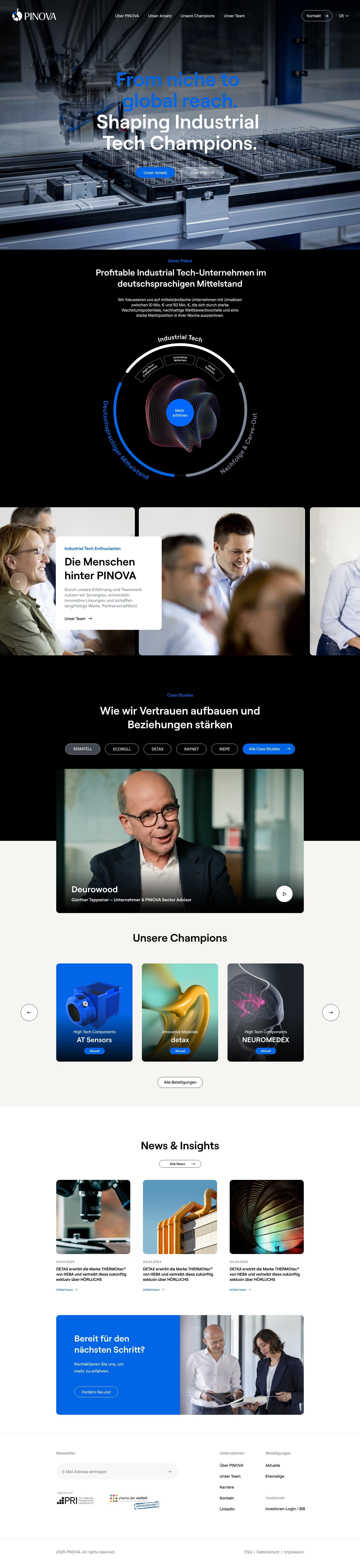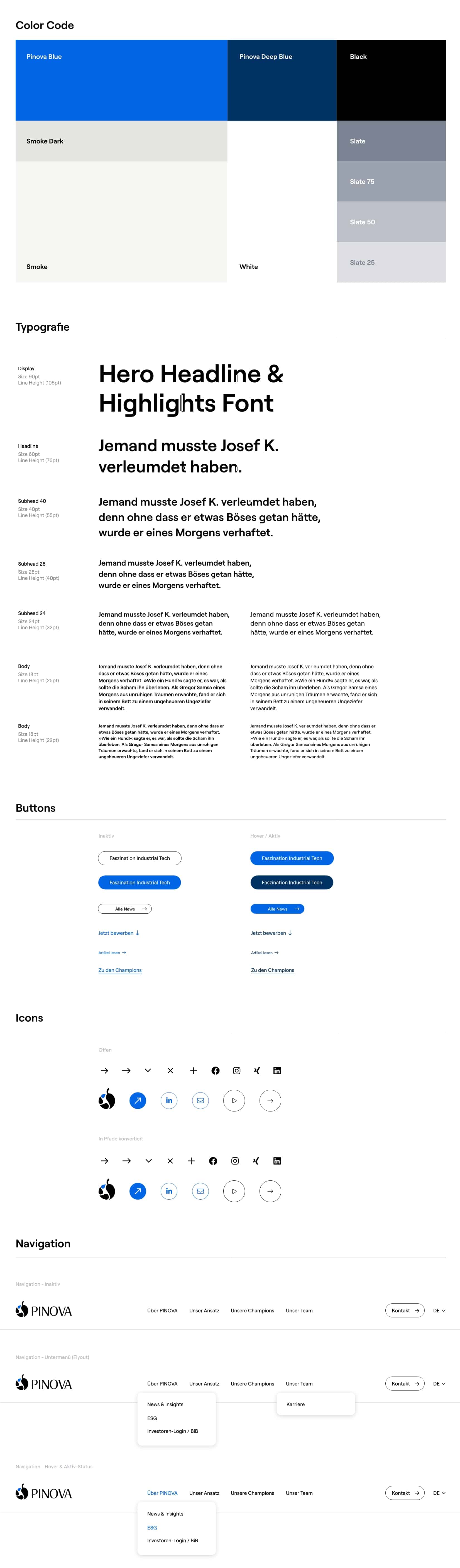 Das neue Designsystem überführt die Marke PINOVA Capital in eine konsistente, digitale Form. Klare Farben, präzise Typografie und eine reduzierte Formensprache schaffen Orientierung und Vertrauen – visuell wie funktional. Das modulare System sorgt für Wiedererkennbarkeit über alle Touchpoints hinweg und ermöglicht eine langfristig skalierbare Markenkommunikation.