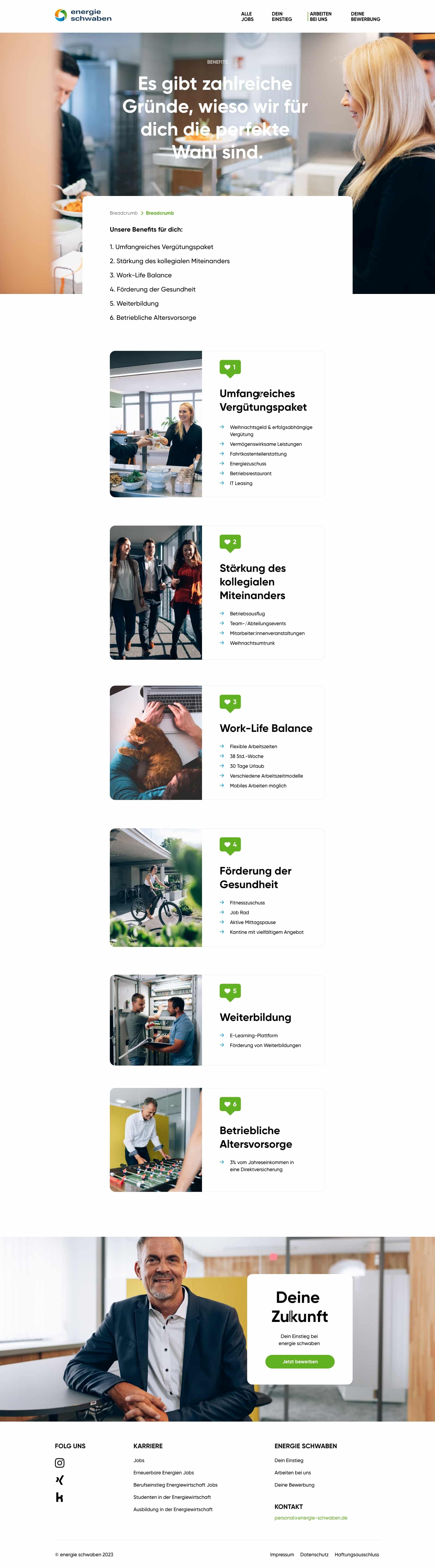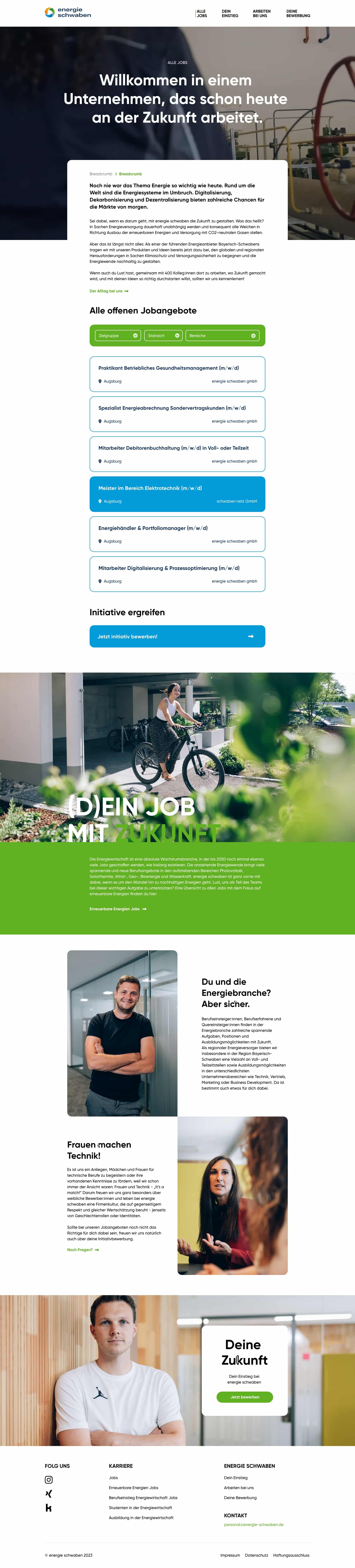 Die damit verbundene Veränderung der Corporate Identity (i.e.S. das Corporate Design) schaffte den Nährboden für eine neue Employer Branding Website, weil der letzte Relaunch bereits im Januar 2020 erfolgt ist. Seither hat sich nicht nur das Unternehmen, sondern auch die Anforderungen, die Mitarbeiter*innen und Bewerber*innen auf dem Arbeitsmarkt stellen, für energie schwaben verändert.