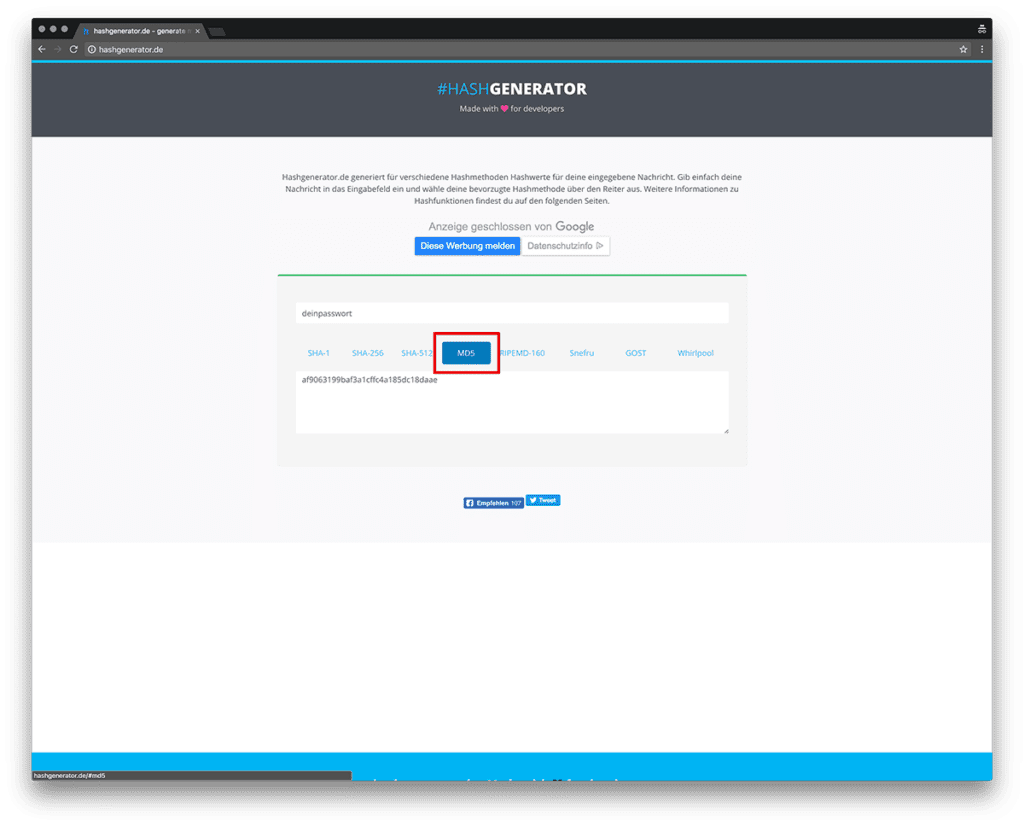 - Öffne nun in einem weiteren Tab deines Browsers folgende Website: www.hashgenerator.de und wähle “MD5” aus. Gib in das Feld oben dein neues gewünschtes Passwort ein. Kopiere anschließend den darunter stehenden MD5 Hash.