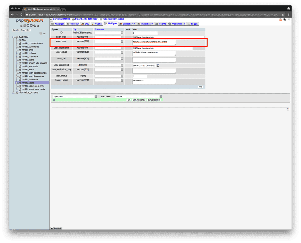 - Gehe zurück in den Tab deiner mit phpMyAdmin geöffneten Datenbank und füge hinter dem Feld “user_pass” in das weiße Eingabefeld deinen kopierten MD5 Hash ein.